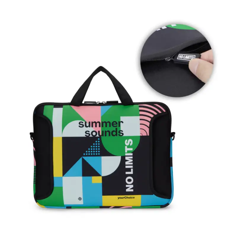 Рекламна чанта за лаптоп с дръжка за носене, изработена от 3 мм удароустойчив неопрен с полиестерно покритие. Чантата е пълноцветно отпечатана по цялата повърхност, от двете страни, по индивидуален дизайн.
