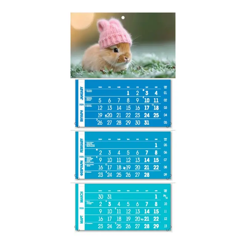 Оригинален цветен календар „Блу“ с три секции – стилен и модерен модел, изцяло в нюанси на синьото. Подходящ за фирми, които искат да подчертаят елегантност и корпоративна визия чрез свежо и изчистено оформление.