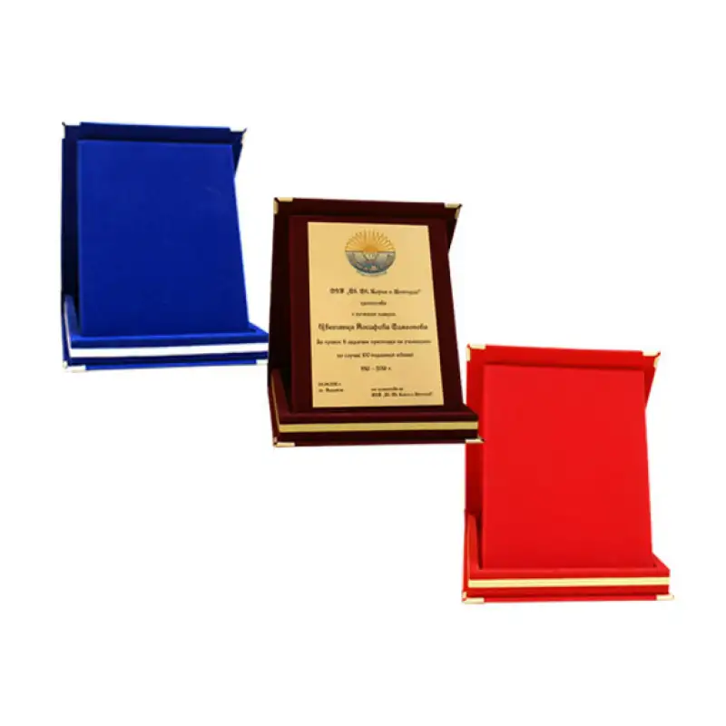 Елегантен плакет с луксозно кадифено покритие и стилни метални ъгли по краищата, създаден за награди, отличия и официални поводи.