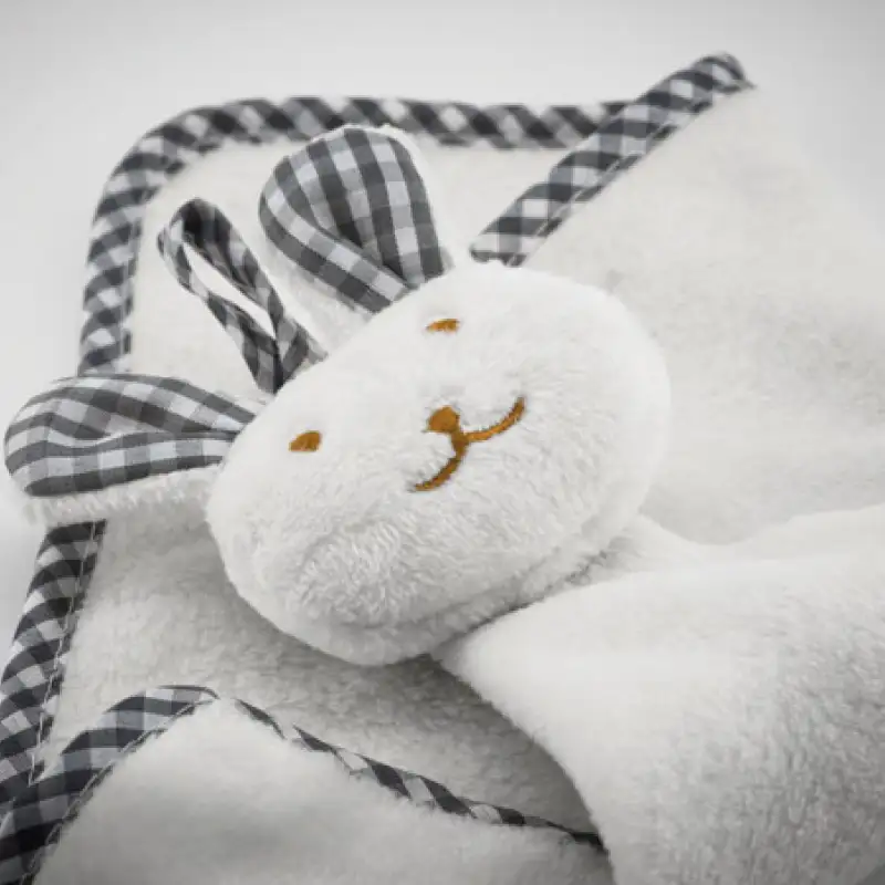 Очарователният дизайн с глава на зайче отгоре превръща кърпата не само в практичен аксесоар, но и в любима играчка за гушкане. Подходяща е за след баня, за разходка или като успокояващо одеялце за сън.
