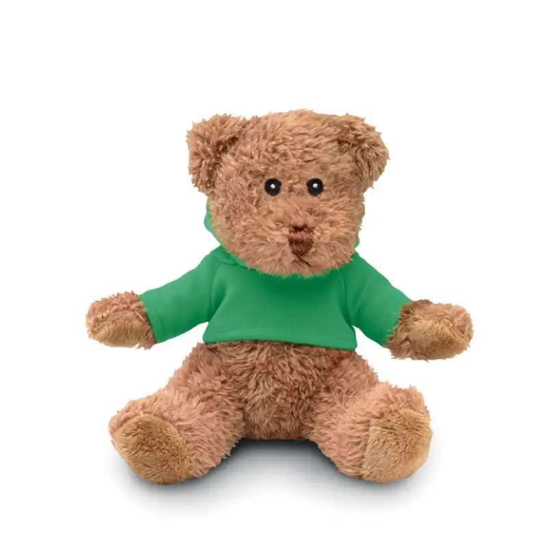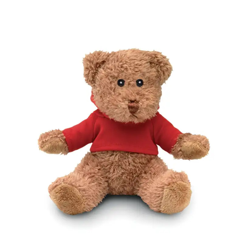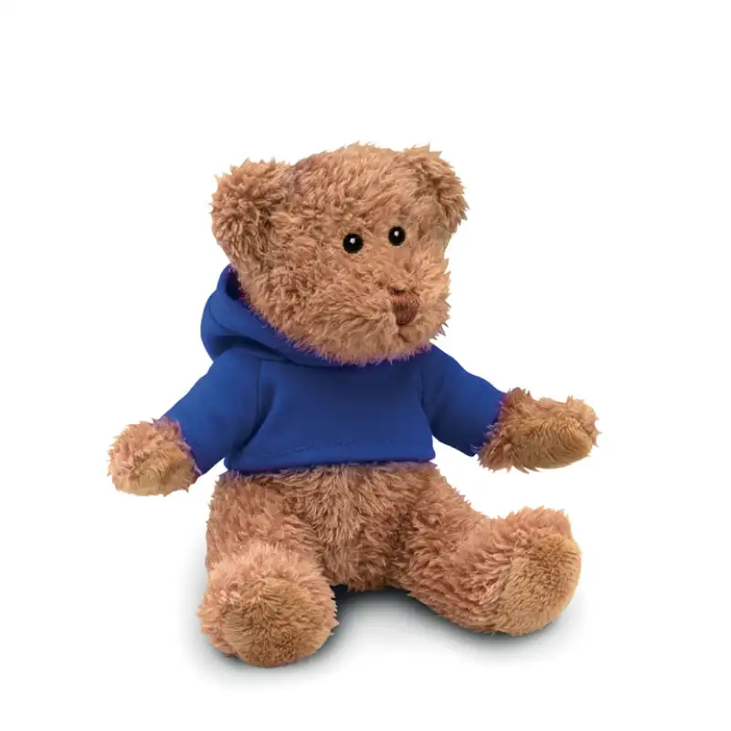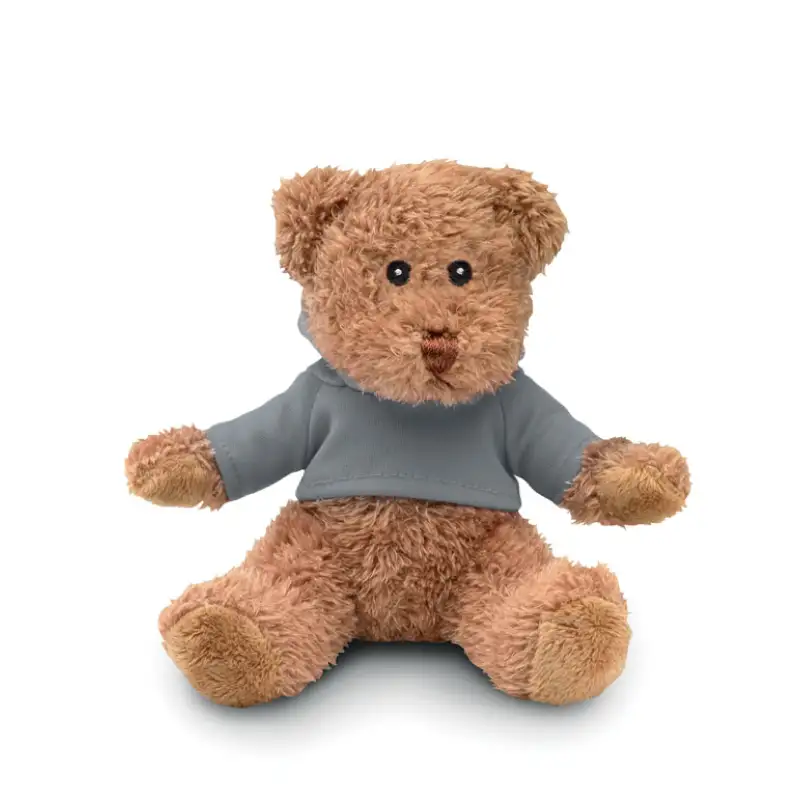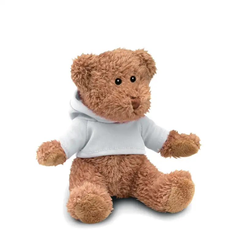 Меко и очарователно плюшено мече, облечено в пуловер с качулка.