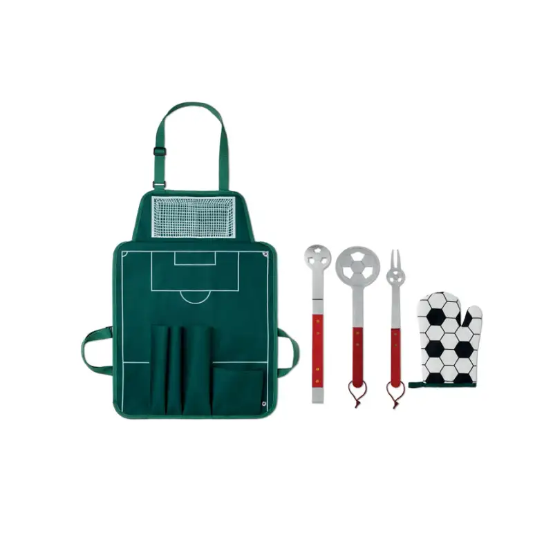Функционална престилка за барбекю, която съчетава удобство и практичност. Изработена от здрав 600D полиестер, тя предпазва дрехите и същевременно служи като удобен органайзер за аксесоарите. В комплекта са включени три различни инструмента за барбекю и една ръкавица, така че всичко необходимо е винаги под ръка. Идеален избор за любителите на скарата у дома или на открито.