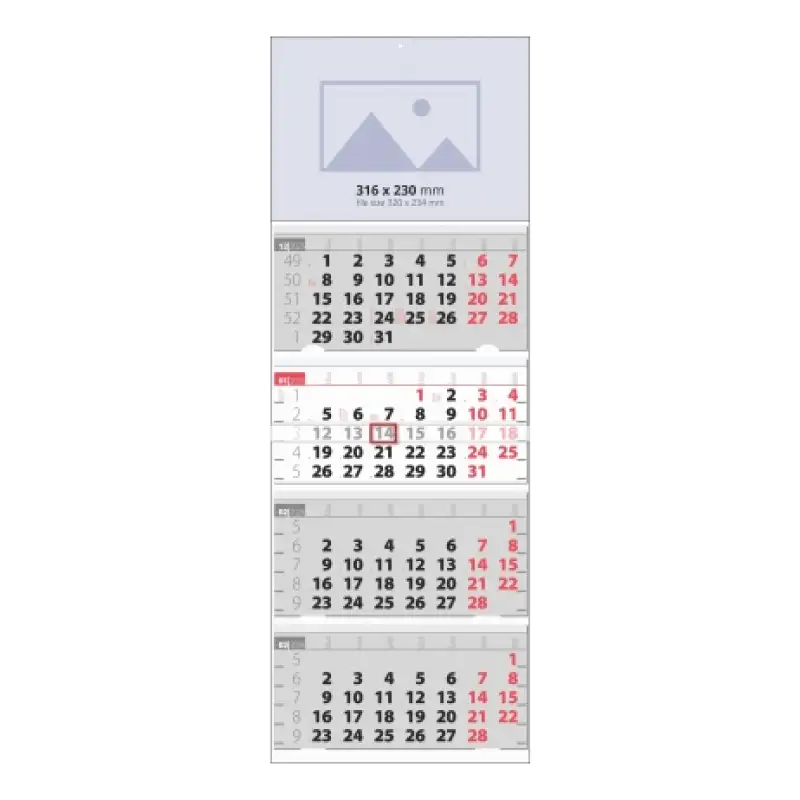 Работен календар „Елит“ с четири тела, размер 923х316 мм, рекламна площ 316х230 мм.