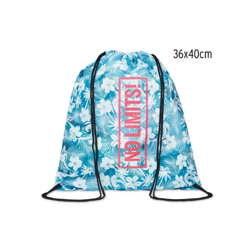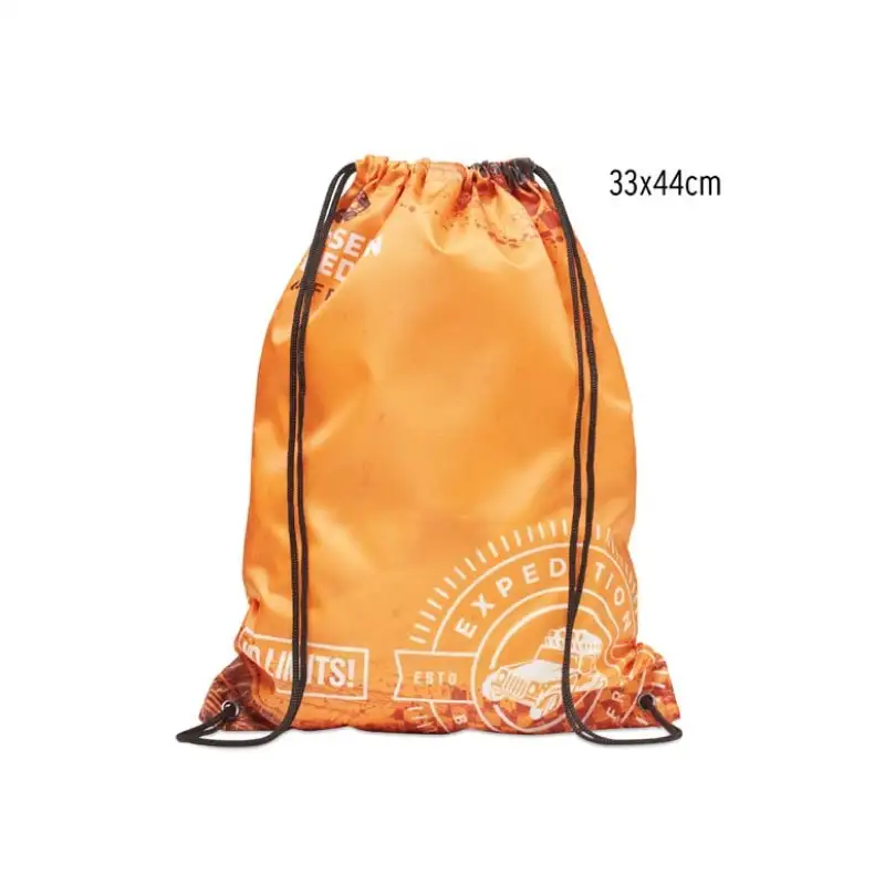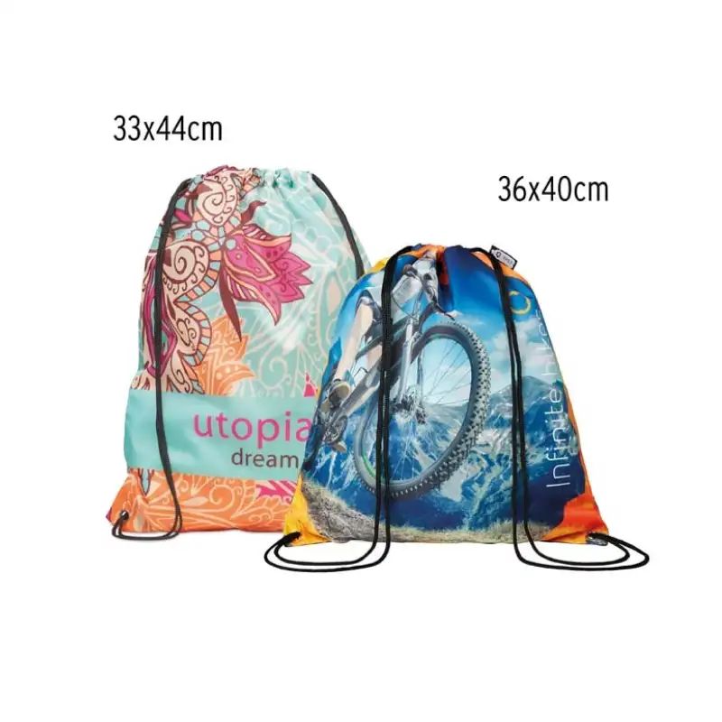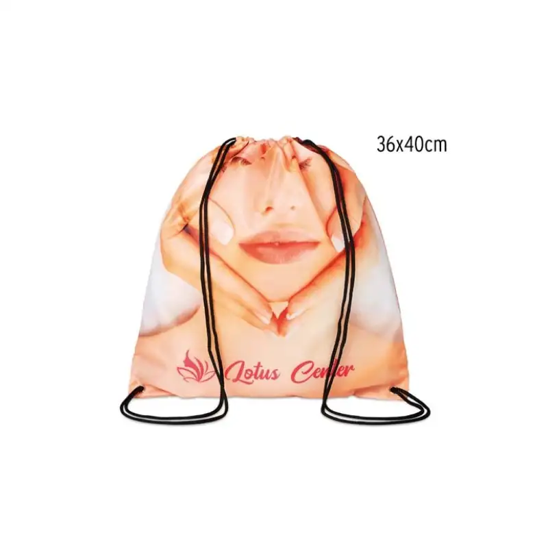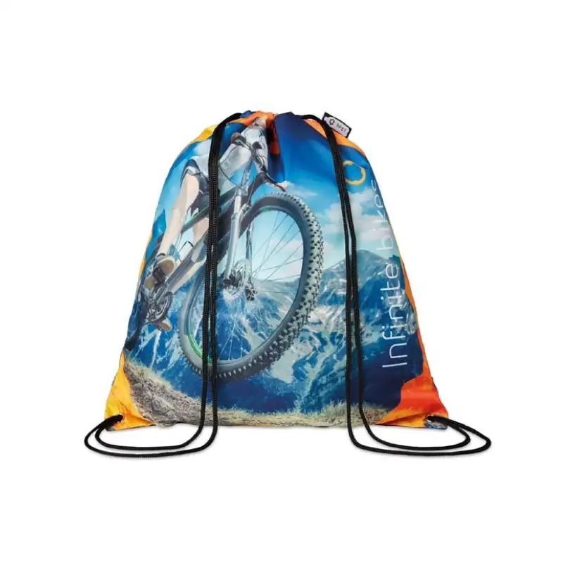 Раница тип мешка с връзки, изработена от RPET рециклиран полиестер. Цялата повърхност е пълноцветно отпечатана по индивидуален дизайн, което я прави подходяща за кампании, събития, училища, спорт и ежедневна употреба.