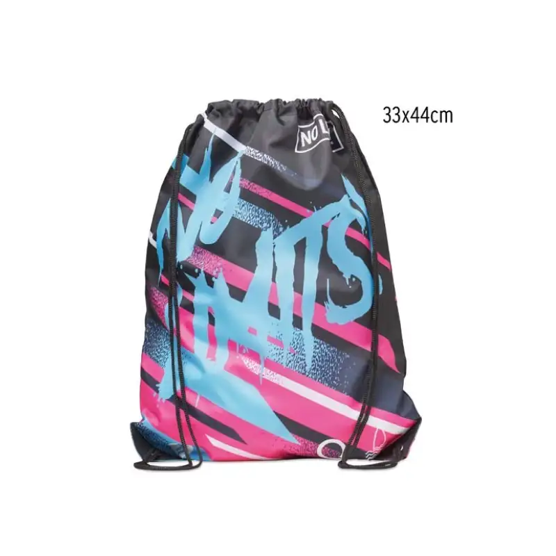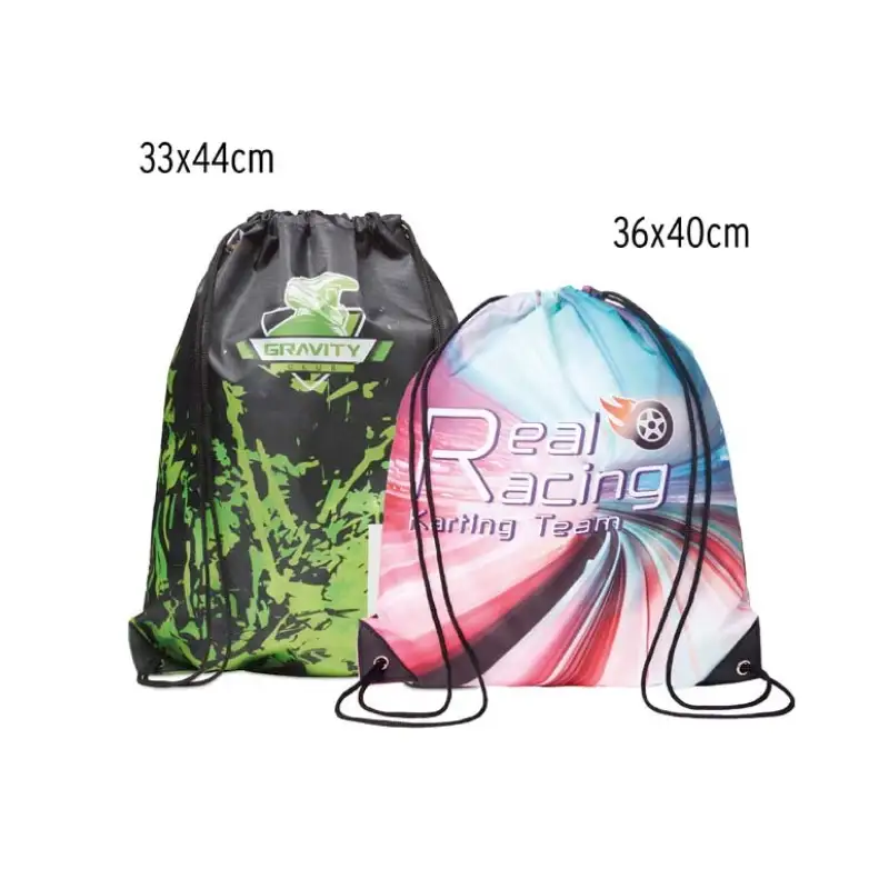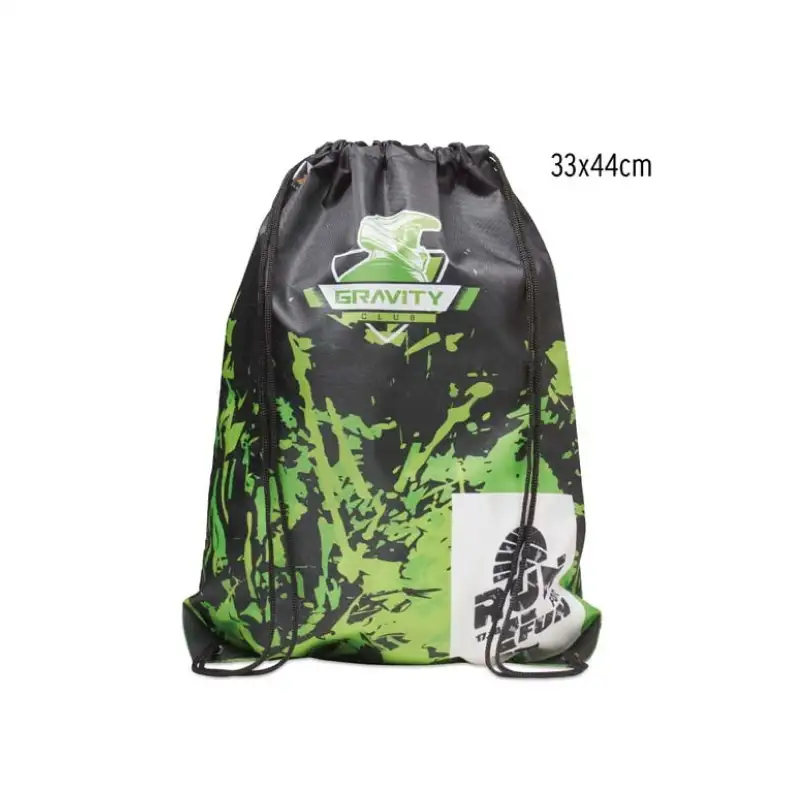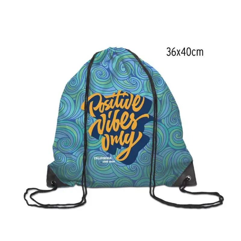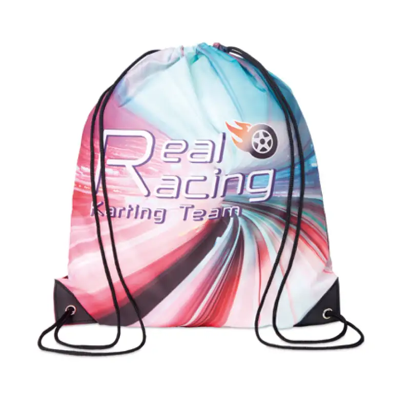 Раница тип мешка с дълги връзки и кожени краища, изработена от 210D полиестер. Цялата повърхност е пълноцветно отпечатана по индивидуален дизайн, което я прави подходяща за събития, кампании, спорт и ежедневна употреба.