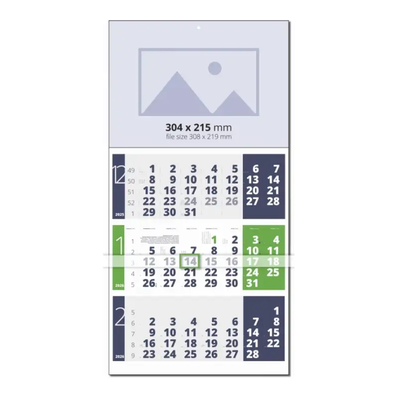 Трисекционен календар „Глобал“ с размер 600х304 мм, рекламна площ 304х215 мм (до 304х220 мм), наличен в четири цветови комбинации и четири езикови версии.
