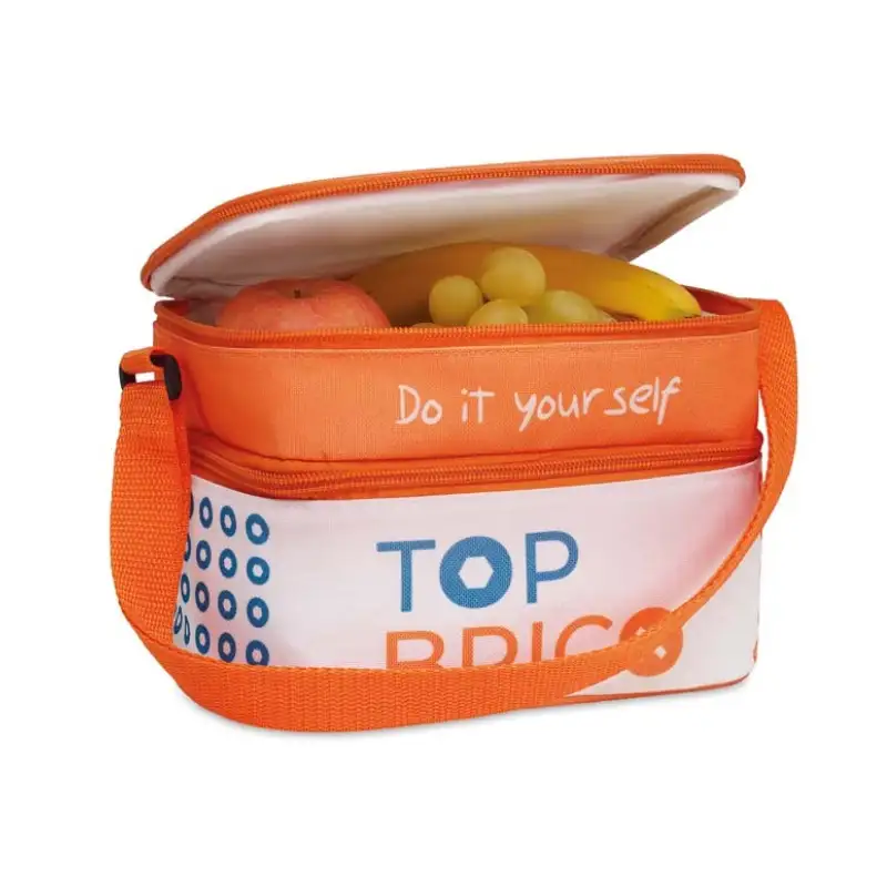 Компактна и практична рекламна хладилна чанта с пълноцветен печат по индивидуален дизайн върху цялата повърхност. Подходяща за фирмени кампании, outdoor събития, пикник, плаж, спортни активности и ежедневна употреба. Моделът позволява избор на цветове за ключови елементи – презрамка и цип, което дава свобода за по-добро съчетаване с корпоративната идентичност.