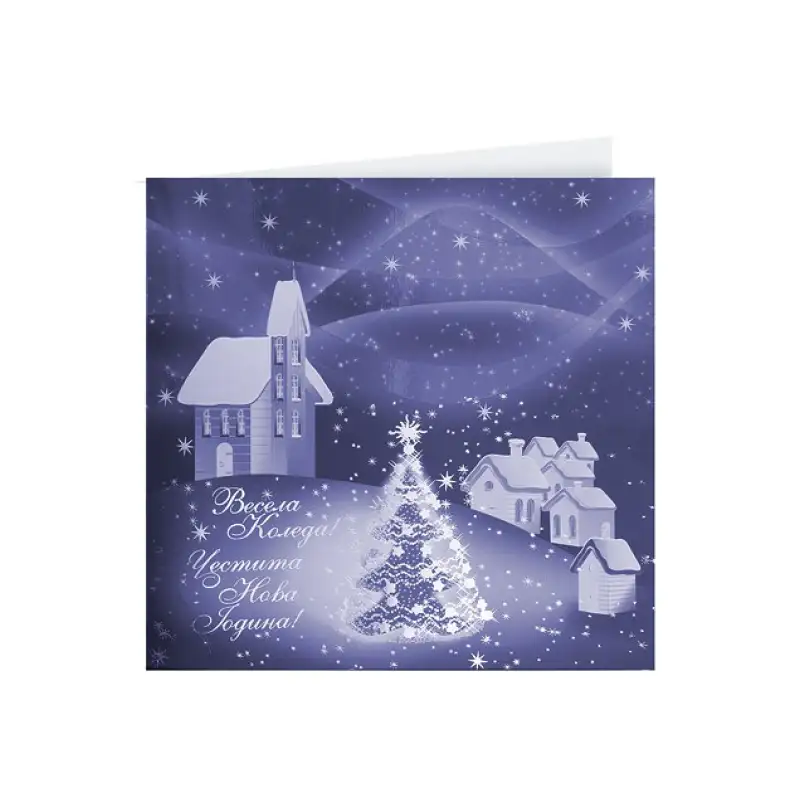 Елегантна поздравителна картичка за Коледа, подходяща за корпоративни и лични пожелания. Включва стандартен бял плик, а по желание могат да се добавят луксозни варианти от перлени, релефни или цветни хартии. Възможност за персонализация с фирмено лого и празнични послания.