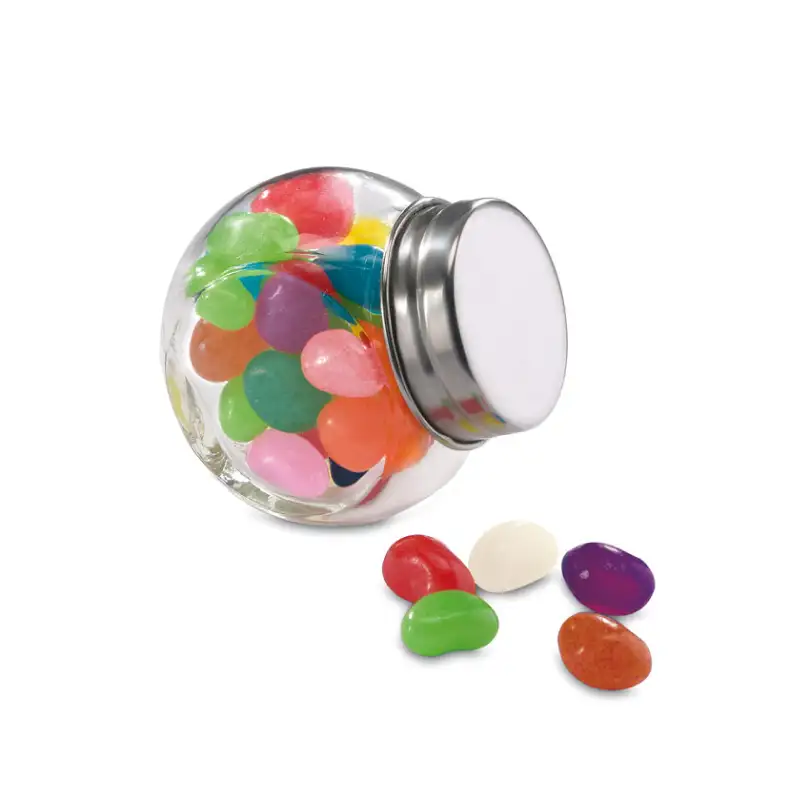 Тези рекламни бонбони представляват цветни желирани бонбони, поднесени в стилен стъклен буркан с метална капачка. Комбинацията от премиум опаковка и ярки цветове ги прави идеален подарък за корпоративни събития, промоции, изложения и брандирани кампании. Във всеки буркан се съдържат 40 грама желирани бонбони, които създават атрактивна и вкусна презентация.
