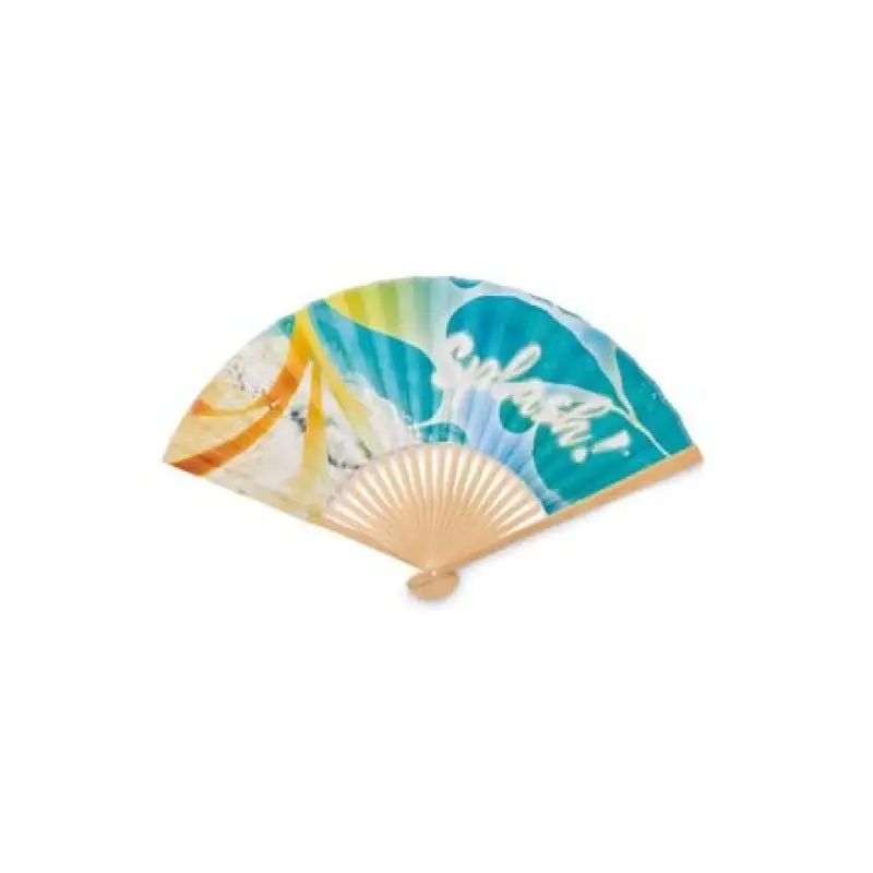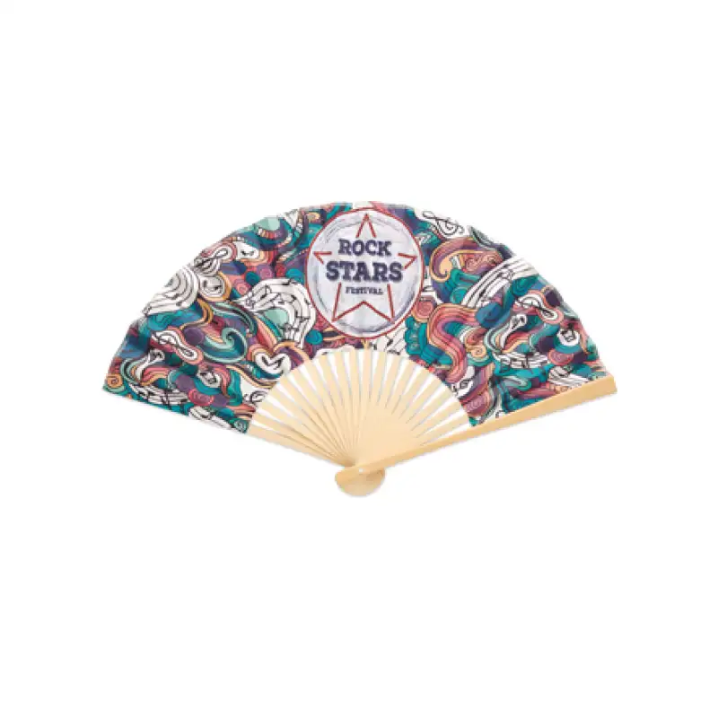 Стилно рекламно ветрило с елегантна визия, съчетаващо естествената текстура на бамбука с ярък пълноцветен печат върху текстилната част. Подходящо за промоции, фестивали, корпоративни събития и летни рекламни кампании.