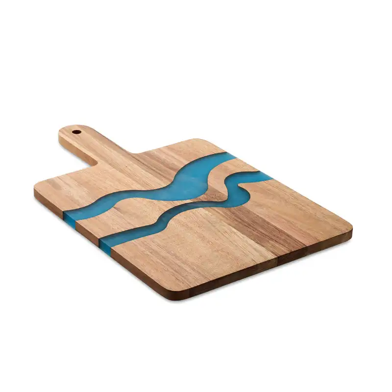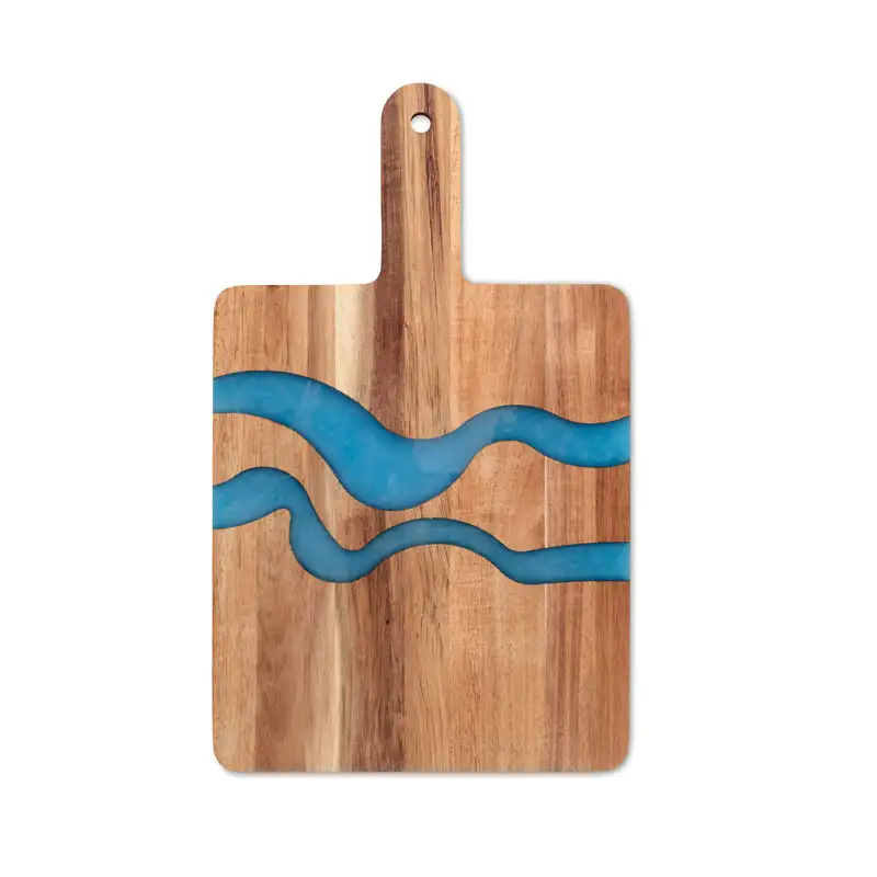 Сервираща дъска, изработена от висококачествено акациево дърво, с елегантен детайл и дръжка от епоксидна смола. Подходяща за поднасяне на сирена, меса, плодове или като стилен декоративен акцент във вашия дом. Естествената структура на дървото придава уникален характер на всеки артикул, като са възможни леки вариации в цвета и размера.
