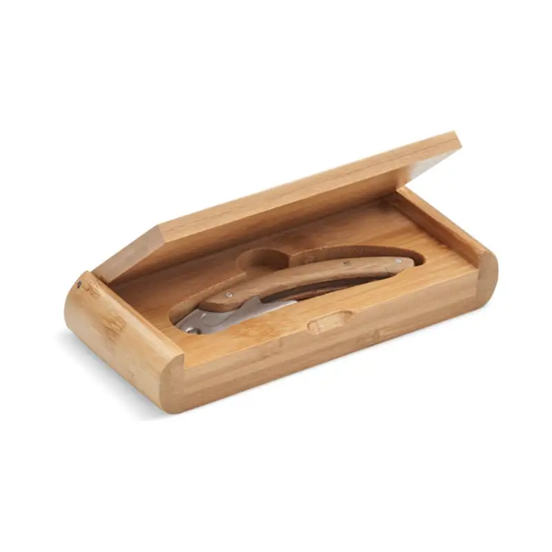 Елегантен сервитьорски нож, изработен от висококачествена неръждаема стомана с естествена бамбукова повърхност. Разполага с двоен тирбушон и отварачка, осигуряващи прецизност и лекота при отваряне на бутилки вино.