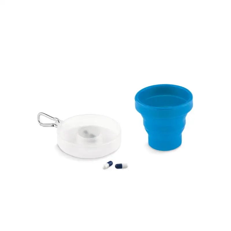 Компактна силиконова сгъваема чаша с вграден контейнер за хапчета и карабинер за лесно прикрепяне към раница или чанта.