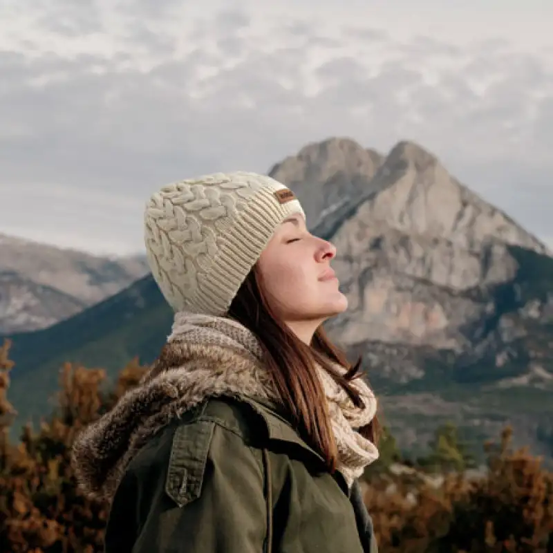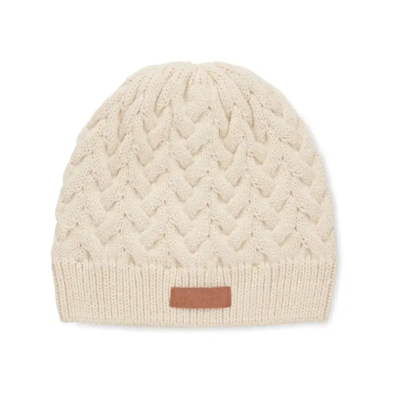 Стилна и устойчива зимна шапка, изработена от рециклирана PET пластмаса (RPET), с плетен мотив и контрастен етикет отпред, подходящ за персонализация.