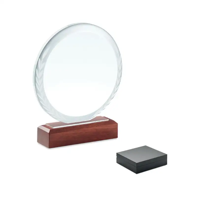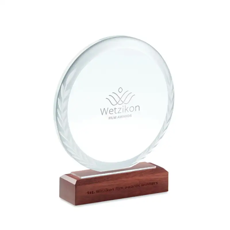 Елегантен кръгъл кристален плакет, съчетаващ прозрачна кристална повърхност и стилна основа от букова дървесина в кафяв цвят.