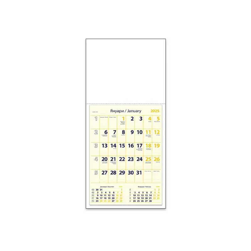 Стенен работен календар „Бележник“ – едносекционен модел с място за водене на бележки. Практичен и функционален, той съчетава календарна информация с удобна зона за записки, което го прави идеален за офиси и дома.