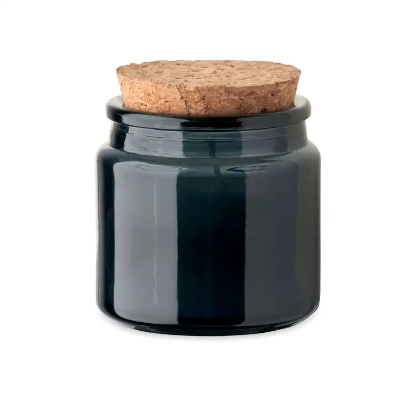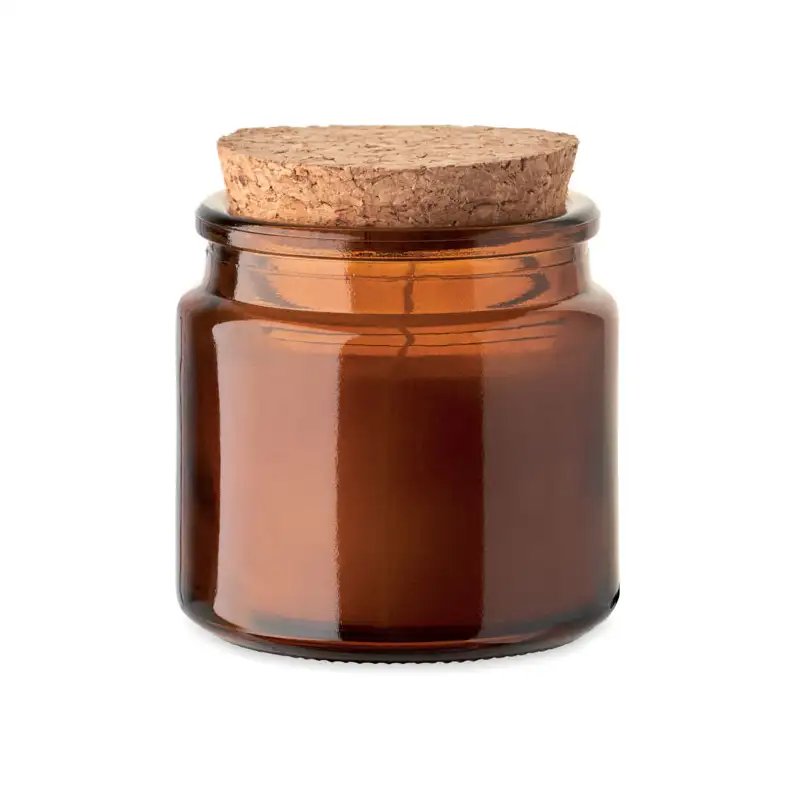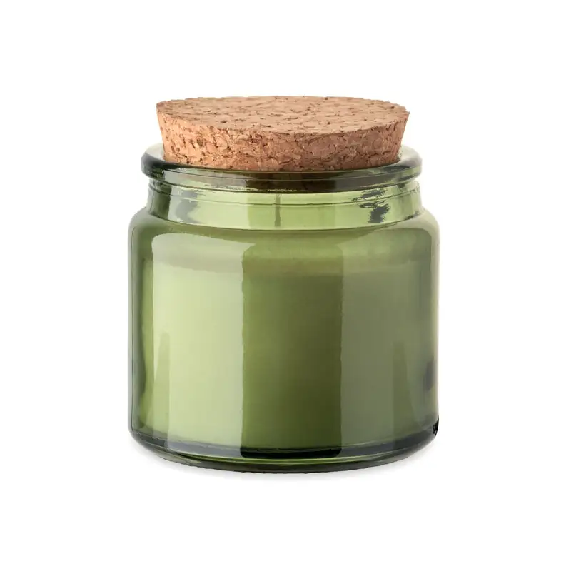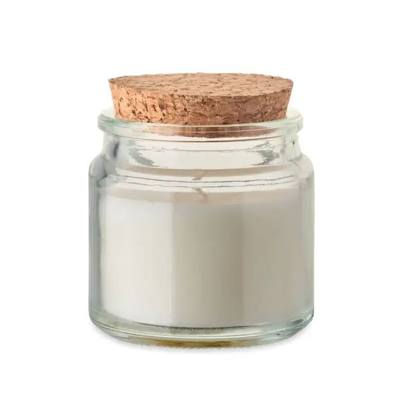 Ароматизирана свещ от растителен восък в стъклен държач с корков капак. Създава релаксираща и приветлива атмосфера, идеална за моменти на спокойствие у дома.