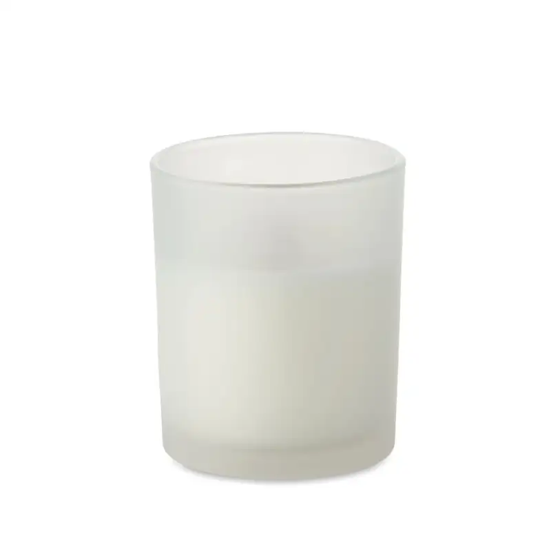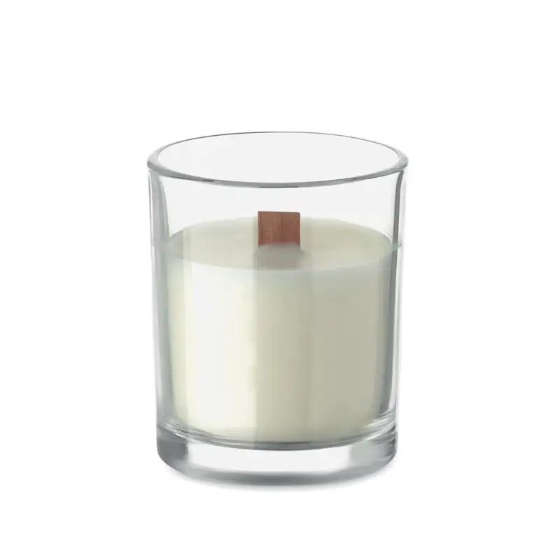 Малка ароматизирана свещ от растителен восък с аромат на ванилия, поставена в стъклен съд с дървен фитил. Идеална за релаксираща и уютна атмосфера у дома или като подарък.