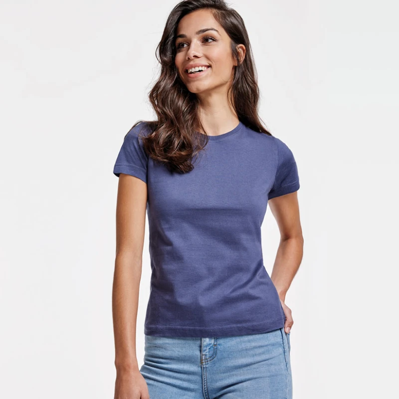Дамска елегантна вталена тениска с къс ръкав, изработена от 100% памук с плътност 160 г/м² – подходяща за промоции, рекламни кампании и ежедневна употреба.