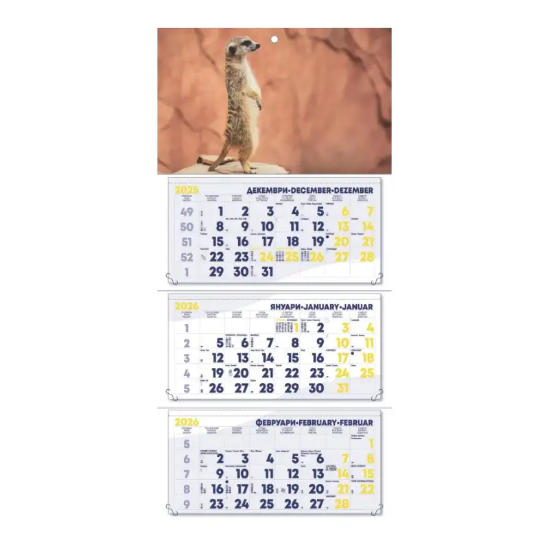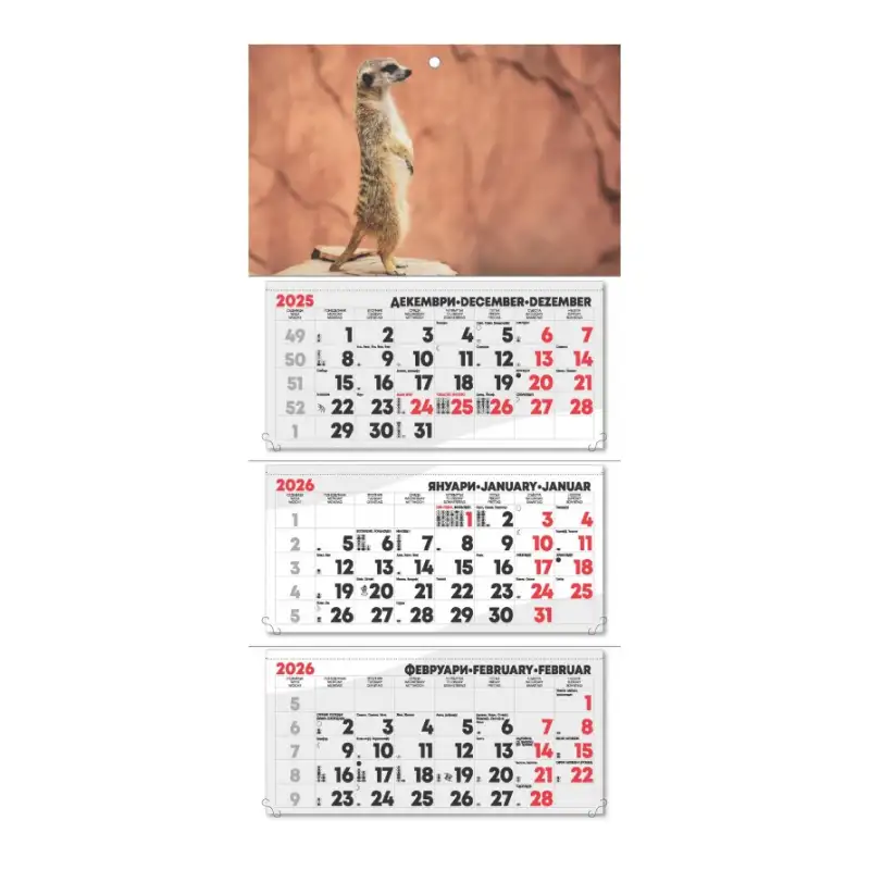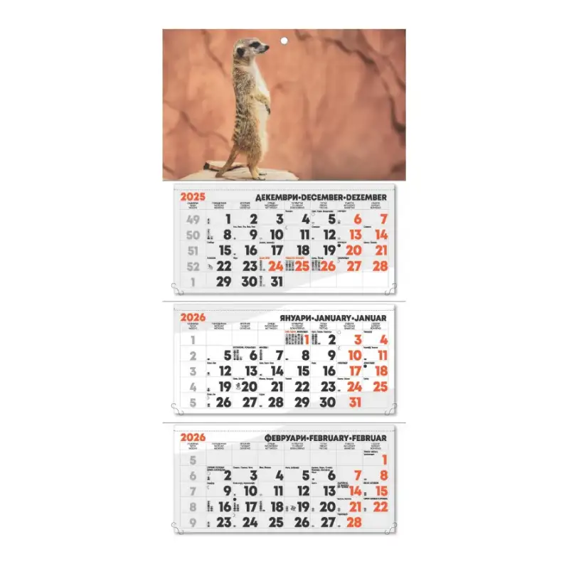 Допълнителна информация: Календарът е с една секция, показваща три месеца едновременно. Включва полезна информация: фази на луната, именни дни, църковни празници и международни празници.
