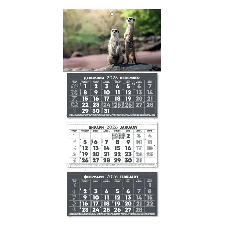 Трисекционен работен календар с три тела в един цвят, изработен от висококачествена хартия и картон, подходящ за корпоративно брандиране и рекламни кампании.