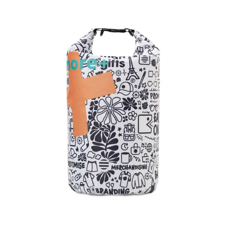 Рекламна водоустойчива чанта с капацитет 10 L, изработена от водонепромокаем RPET (рециклиран полиестер) и отпечатана пълноцветно по индивидуален дизайн върху цялата повърхност.